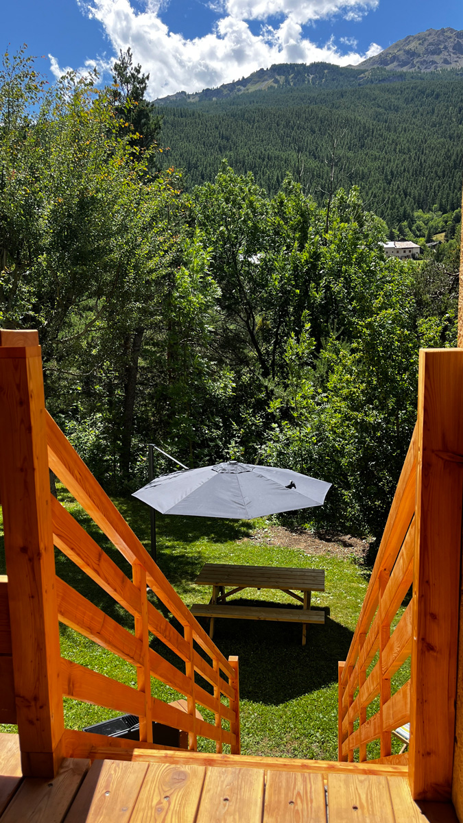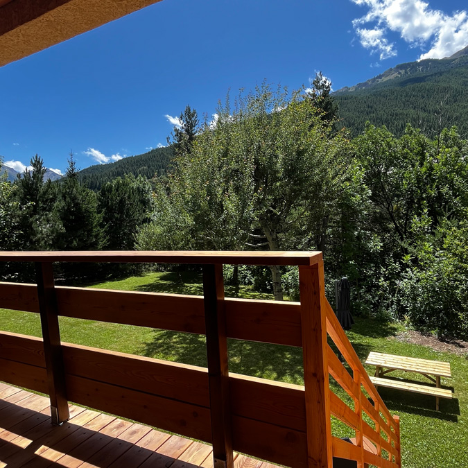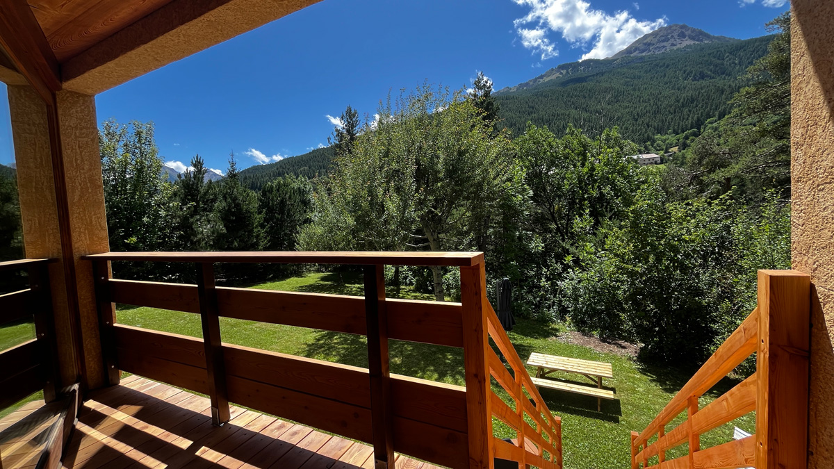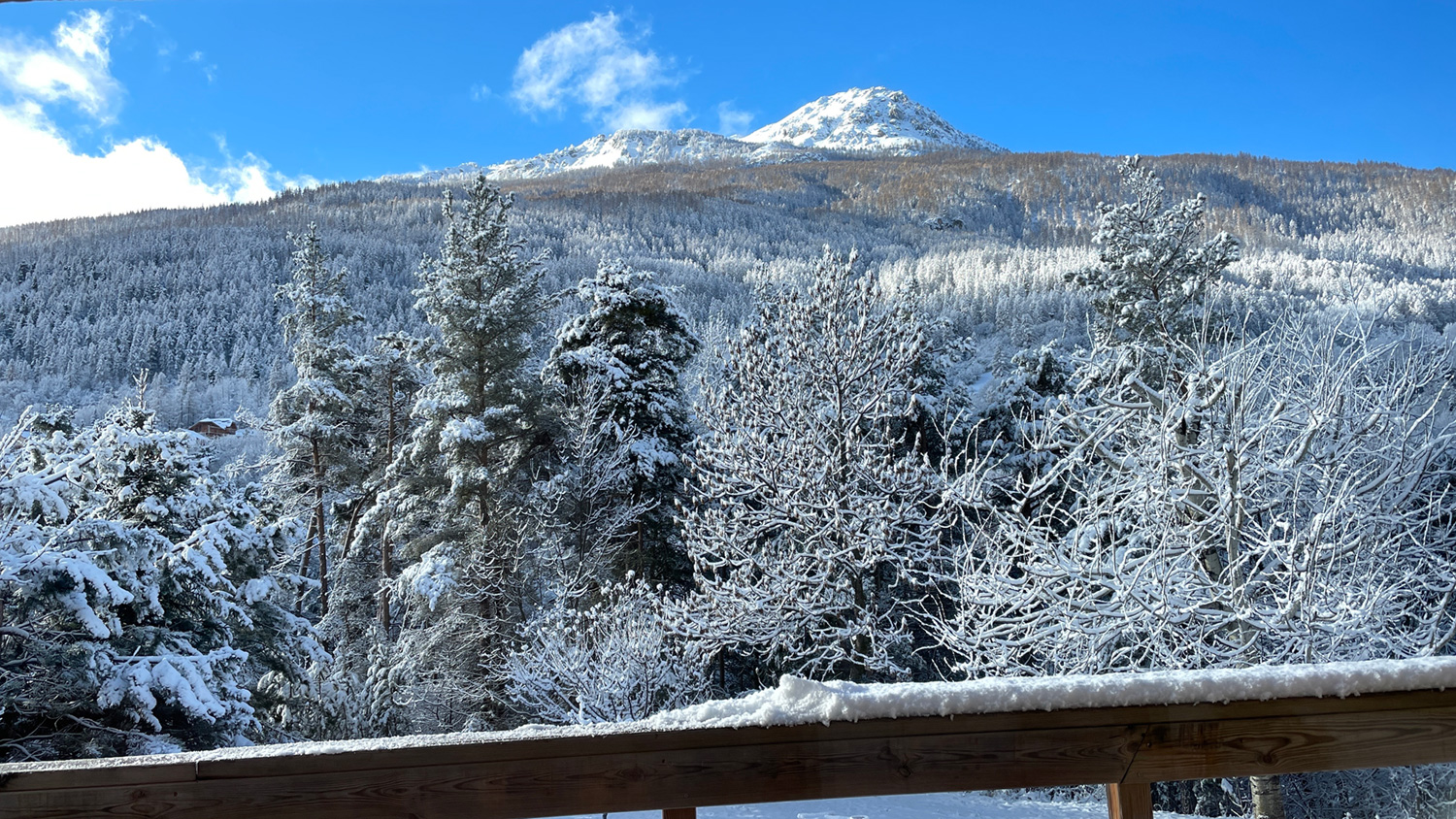 Le salon est aménagé pour recevoir confortablement 8 personnes : 2 canapés, des poufs et une table basse pour l'apéro ; une grande table pour partager le repas ! La cuisine attenante est équipée à neuf. Les pièces sont très lumineuses, exposées au Sud avec vue imprenable sur le Prorel et sa forêt de mélèzes.